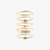 Stackable rings from our Temple of the Sun collection. This extra luxurious combo consists of the following 5 rings: 1 Simple Coulée Ring, 2 Eye of Horus Braided Ring, 1 Simple Cléo Diamond Ring, and 1 Trinity Sunrise Ring.