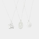 These Sterling Silver necklaces are already layered and ready to go. Combined the Luna, Madonna, and Kris charms on this combo. Made to layer with your sundress while you run in fields of flowers or for dancing under the moon in that glowing skin of yours. We combined different chains to offer some texture.