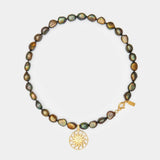 This black pearl beauty is adorned with the Aurora pendant, a lioness with diamond eyes inside a powerful sun medallion. Genuine pearls and diamonds, handmade with love.