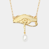 Inspired by the female goddesses from ancient Egypt, the Maryam necklace is a bold and unique piece. The golden handcrafted eye of Horus is adorned with a tear of joy made from a naturally shaped freshwater pearl.
