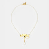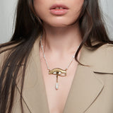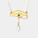 Inspired by the female goddesses from ancient Egypt, the Maryam necklace is a bold and unique piece. The golden handcrafted eye of Horus is carefully painted in resin and adorned with a tear of joy made from a naturally shaped freshwater pearl. Perfect for layering with other golden chains at the beach.