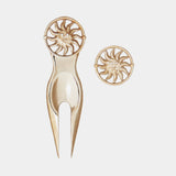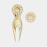 Introducing the Aurora Divot Jewel and Ball Marker Set, a fusion of artistry and functionality from Montréal. The divot repair tool features our signature Aurora design—a lion's head sun motif adorned with two exquisite stone eyes. Complementing this is a ball marker crafted in the same iconic Aurora design, ensuring a cohesive and stylish addition to your golf accessories. Available in Bronze, .925 Sterling Silver or 14k Gold Vermeil options, each piece offers the option for custom engravings on the back, making it a cherished gift for any golf aficionado.Presented in a leather style pouch, designed in Montréal, this set epitomizes luxury and is ideal for enhancing your golfing experience or commemorating special occasions with style.
