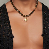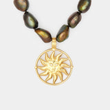 This black pearl beauty is adorned with the Aurora pendant, a lioness with diamond eyes inside a powerful sun medallion. Genuine pearls and diamonds, handmade with love.