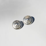 These handcrafted earrings are the perfect choice for a bold look, inspired by women in power suits from the 90s. Walk with a fierce step from daytime right into the night with these button-like studs.