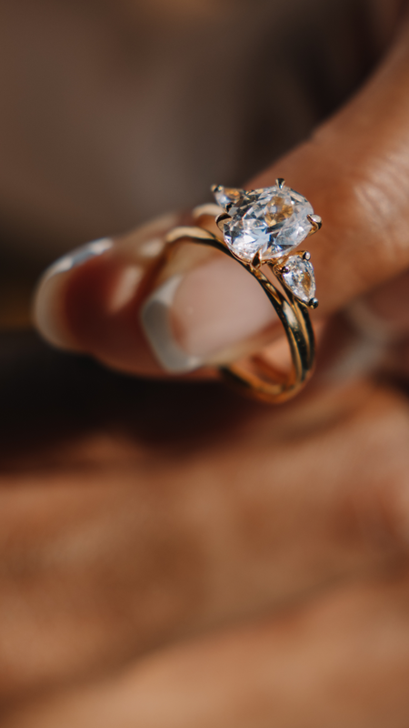 A unique and bold design we created for a client, featuring a 1.75 ct VVS1 lab-grown pear-shaped diamond and delicate marquise-cut accent stones set along the band.
